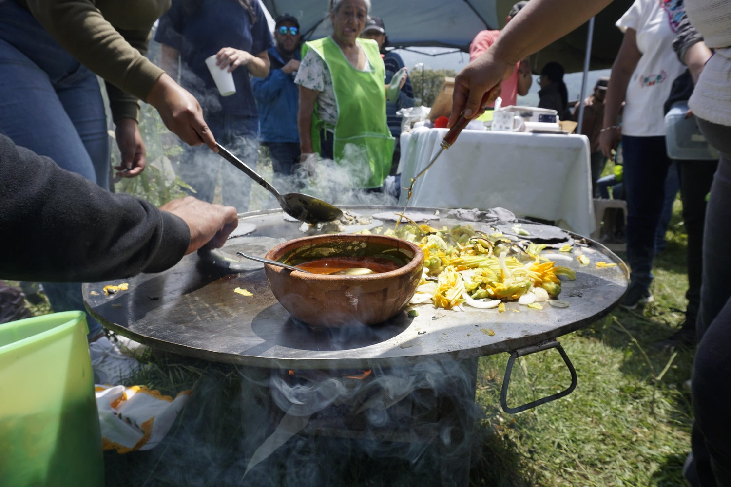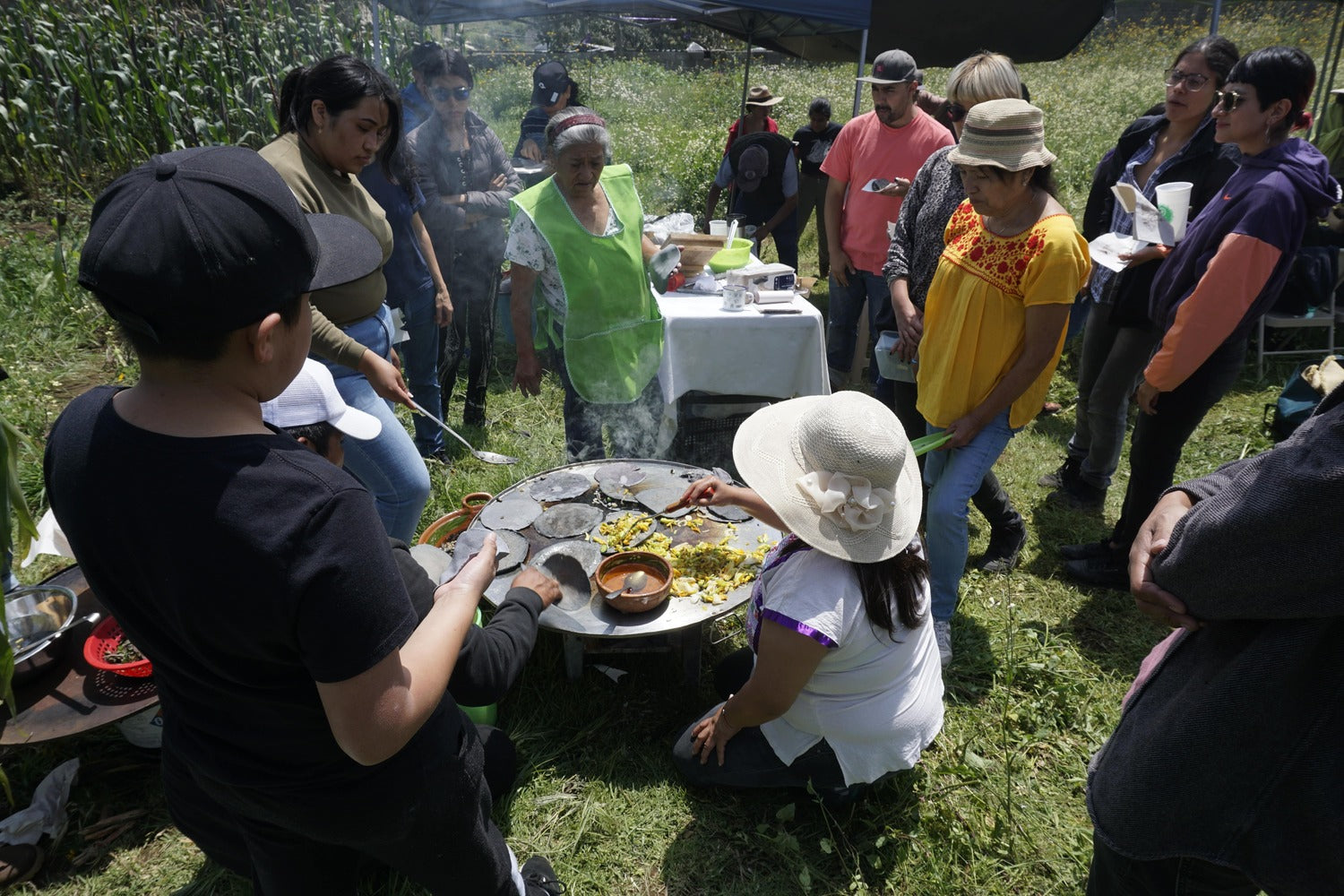 - Comida colectiva y elotiza que incluye atole, tamales, tlacoyos y quesadillas hechas con maíz criollo nixtamalizado