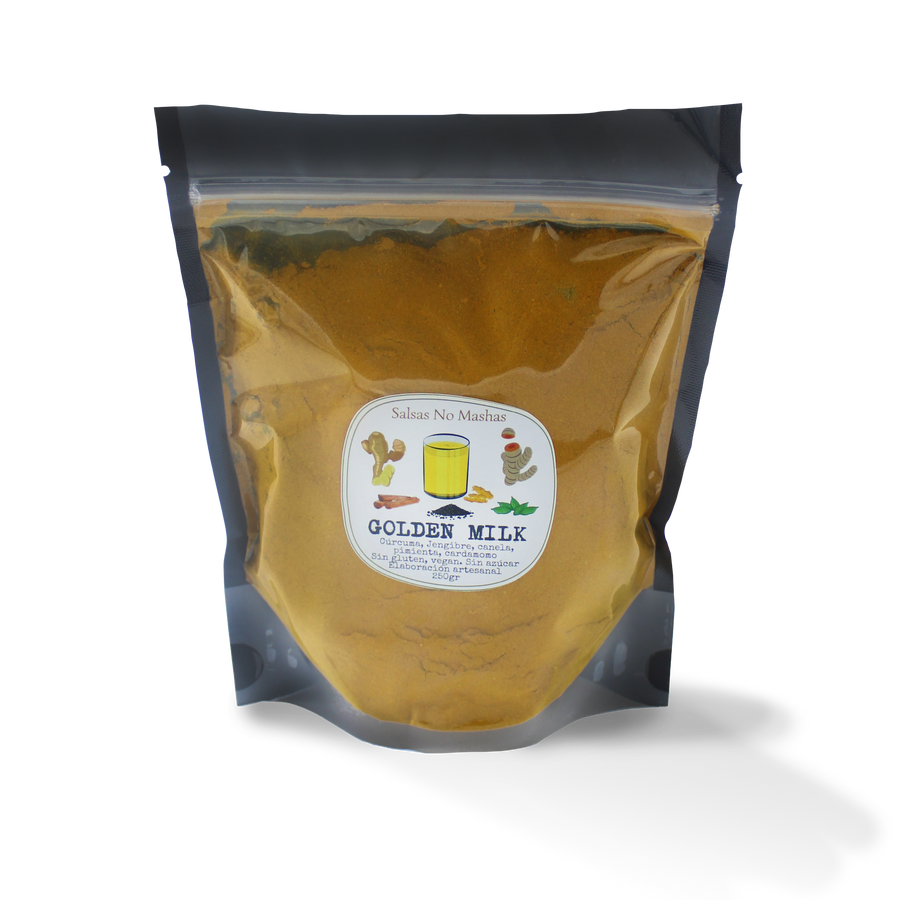 Mezcla para preparar leche dorada con cúrcuma, jengibre, canela, cardamomo, pimienta, sin azúcares añadidos, sin gluten, vegano. Sin conservadores químicos, elaborado artesanalmente.